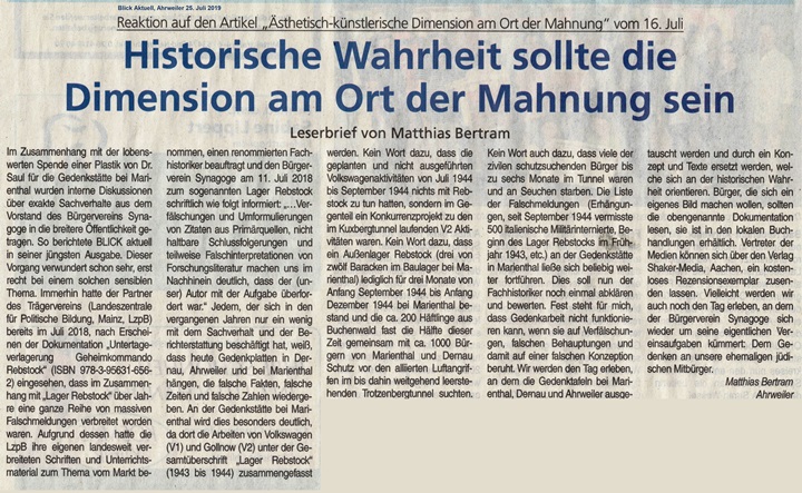 Deutlicher kann man sich kaum zu den seit Jahren immer wieder neu vorgebrachten Behauptungen äußern. Da wundert es wenig, wenn die Stadtzeitung Bad Neuenahr-Ahrweiler nach dem Vortrag des Historikers Prof. Dr. Manfred Grieger in ihrer Ausgabe 28/2021 von den für viele gar nicht so neuen Erkenntnissen spricht. Der Artikel (Anlage) unter der Überschrift: