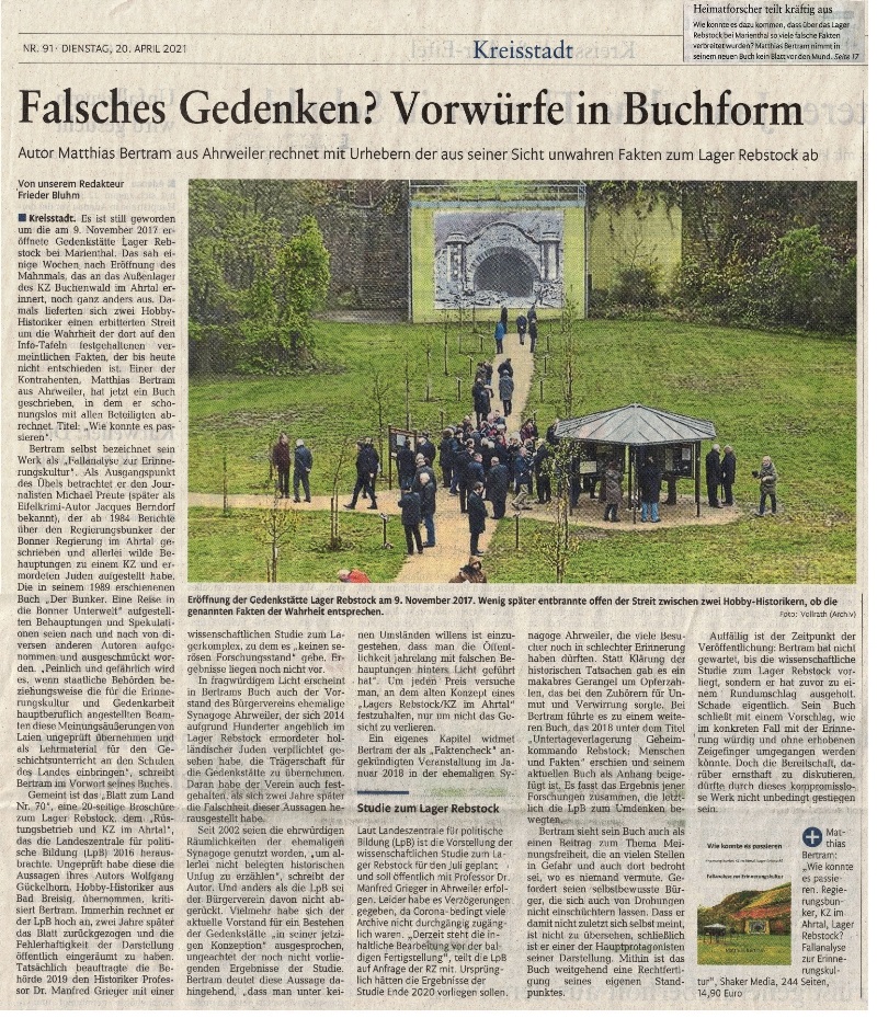 Ein kritischer Artikel in der Rhein-Zeitung, Koblenz, zur Berichterstattung über nie erwiesene Massengräber, Ermordungen und Erschiessungen, die jahrzehntelang auch von den Medien in der Region verbreitet wurden. Wenn Diskussionen nicht helfen und nüchterne Quellenverweise nicht gewollt sind, hilft manchmal nur eine deutliche Ansprache, um diejenigen wachzurütteln, die sich erst vor einen Karren spannen lassen, der unwahre Geschichten verbreitet und dann nicht die Courage haben sich für die jahrelange falsche Berichterstattung zu entschuldigen. Auch die Presse hat hier kein gutes Beispiel eines hinterfragenden Journalismusses abgegeben. Wenn die Presse zu feige ist zweifelhafte Behauptungen ernsthaft zu hinterfragen, nur weil die Politik hinter den Behauptungen steht, , dann sollten es Privatpersonen machen. Dann halt nicht in der Zeitung, sondern in Buchform.