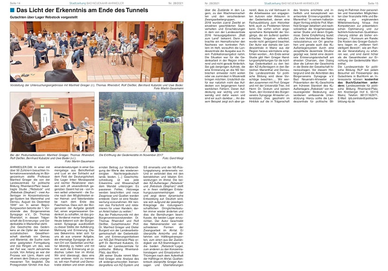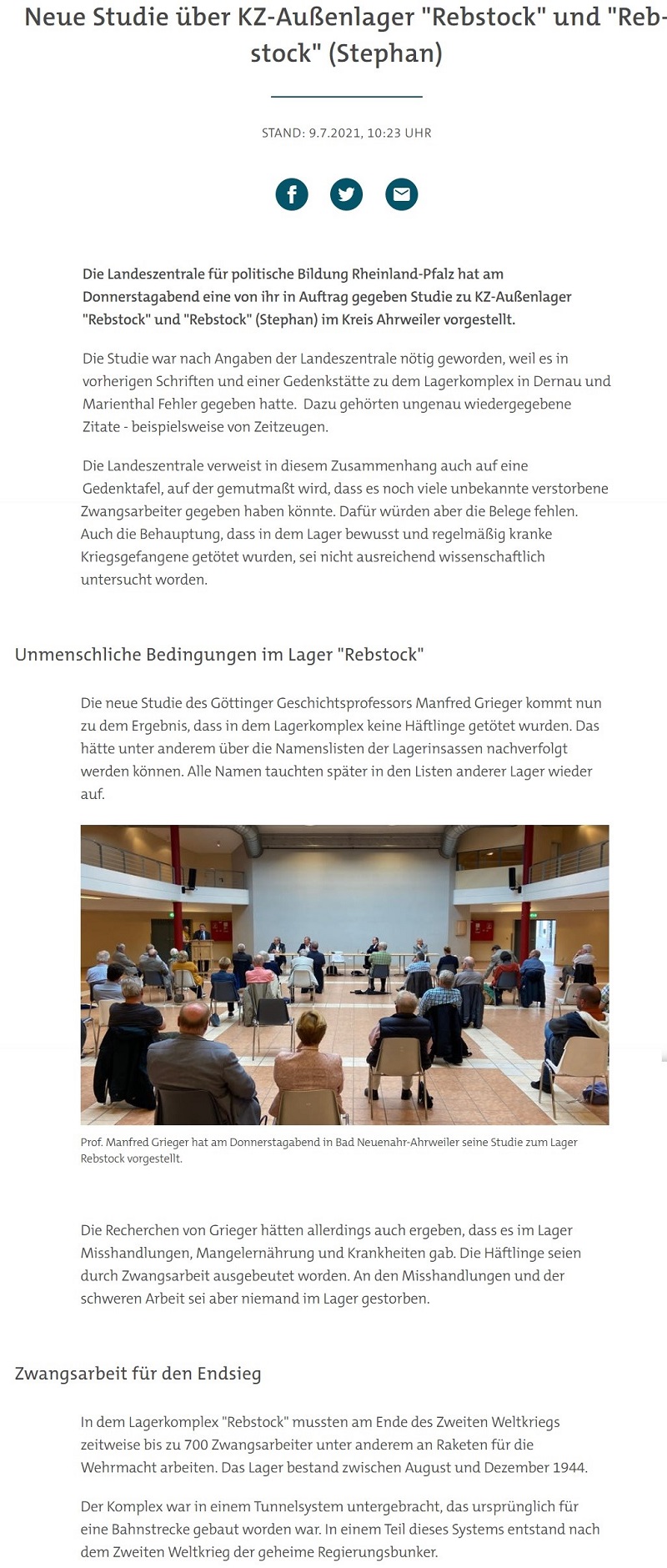 Am 8. Juli 2021 legte der von der Landeszentrale für politische Bildung beauftragte Prüfer/Historiker seine lange erwartete Studie zum Projekt "Rebstock" vor. Er hatte untersuchen sollen, ob die Behauptungen der Landeszentrale bzw. des Bürgervereins ehemalige Synagoge, es sei im Ahrtal -wie von ihr behauptet- im Projekt Rebstock zu systematischen Tötungen von Kranken unter insgesamt behaupteten 1500 Opfern gekommen, den Tatsachen entsprechen würde. Kritiker hatten diesen Behauptungen seit Jahren vehement widersprochen und nachgewiesen, dass es nicht zu einer einzigen Tötung direkt vor Ort gekommen sei. Nun hielt der renommierte Historiker Dr. Grieger fest: