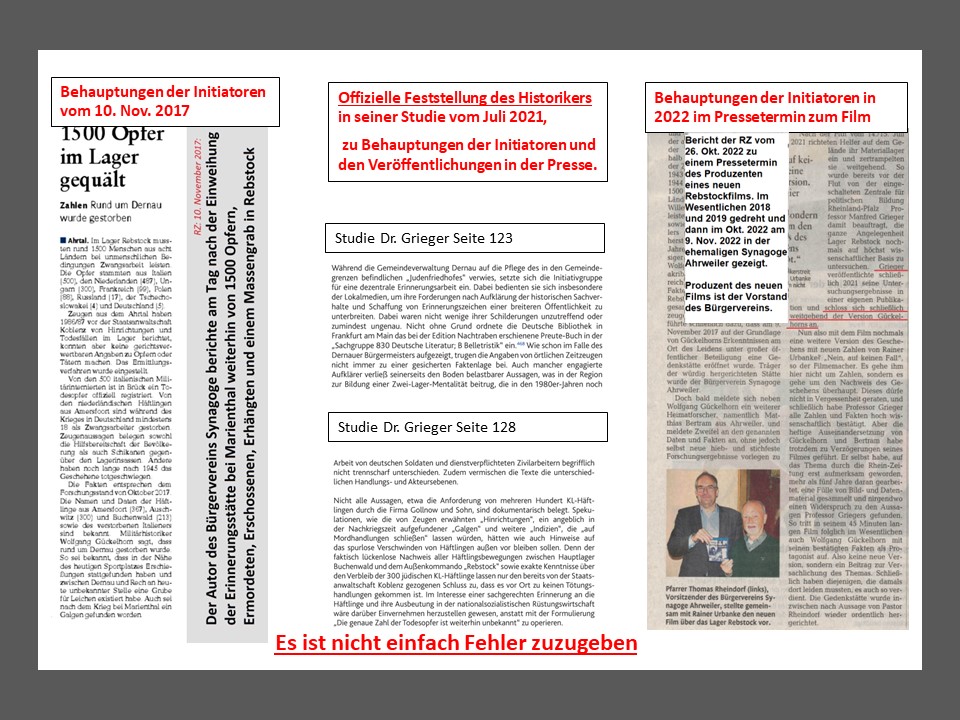 Die falschen Aussagen führten dazu, dass das Land Rheinland Pfalz für ca. 100.000,-€ eine Studie in Auftrag gab, um die Behauptungen ebendieses Vereines zu verifizieren, was nicht gelang. Der Historiker konnte nur festhalten: Nein, so war es nicht. Der Verein und sein Autor hätten diese Aussagen besser nicht gemacht. Als Konsequenz daraus wird nun im Auftrag des Landes (Wissenschaftministerium)vom Historiker und der Uni Trier ein korrigiertes Gedenkkonzept erabeitet, um dem Bürgerverein zu helfen, dieses neue wissenschaftlich fundierte Konzept umzusetzen. Dies war im Juli 2021.