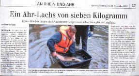 o       In den letzten Jahren wurde viel für die Renaturierung von Flussläufen getan, um den Lachs am Rhein und in seinen Nebenflüssen wieder heimisch werden zu lassen. Beachtliche Erfolge sind dabei (wohl am weitesten fortgeschritten an der Sieg) erzielt worden. Das nachstehende Photo, welches noch bis in die achtziger Jahre in einer Gaststätte in der Ahrweiler Oberhut hing, zeigt, wie real der Lachsfang in der Ahr im Raum Sinzig noch um 1915 war. Das Photo wurde von Herrn Theo Simons zur Verfügung gestellt. Details zu diesem Thema findet man auf der Seite: www.arge-ahr.de