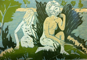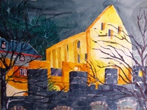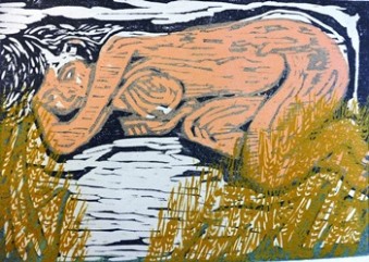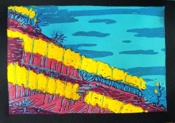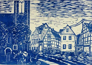 So langsam, zwei Jahre nach den Zerstörungen durch die Flut, sollen die eigenen künstlerischen Aktivitäten wieder aufgebaut werden. Als erstes nehme ich zur Zeit (Laufzeit bis 19. Mai 20023) an einem Online-Kunstwettbewerb teil, der seit etlichen Jahren einmal im Jahr durchgeführt wird. Ich nehme mit einem Farbholzschnitt teil, der in mehreren Druckvorgängen und mit mehreren Druckplatten erstellt wurde. Eigentlich ist es ein Testdruck. Aber er scheint mir recht gut gelungen, sodass ich ihn einfach mal zum Wettbewerb eingestellt habe.