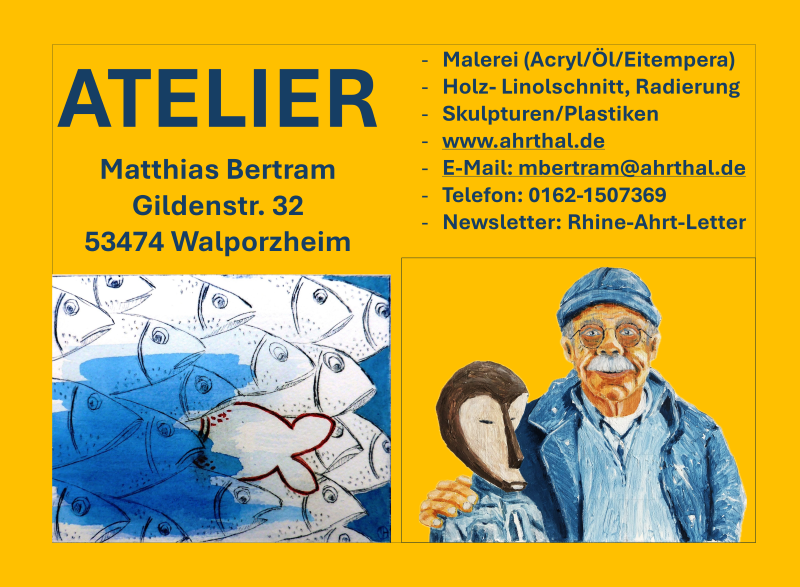 Zwischenzeitlich beziehen über 1000 Interessenten den unten beschriebenen Newsletter "Rhine-Ahrt-Letter". Ich denke, das ist ein schöner Erfolg. Viele positiver Rückmeldungen konnte ich erhalten. Das freut mich insofern, da das Projekt nun auch von der Kreisverwaltung im Rahmen der Kulturförderung unterstützt wird. Grund genug weiter daran zu arbeiten, auch wenn ich sagen mus: Den Arbeitsaufwand habe ich erheblich unterschätzt. Aber zumindest bis Ende des jahres 2024 wird der Newsletter in der heutigen Form weiter erscheinen. In Kürze erscheint ein monatlicher kostenloser Newsletter (Rhine-Ahrt-Letter), der Sie zu Ereignissen
