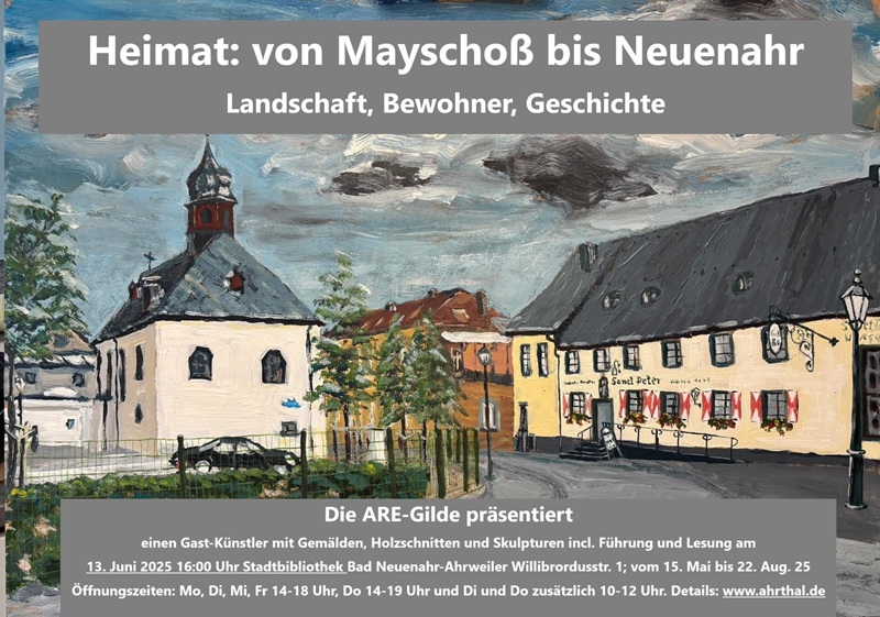 Nun kommt es in der Stadtbiliothek in Bad Neuenahr zu einer Ausstellung von Gemälden, Drucken und Skulpturen zu diesem Thema. Die Ausstellung ist bereits eröffnet. Offiziell wird sie am 13. Juni 2025 um 16:00 Uhr von der Präsidentin der ARE-Gilde der Öffentlichkeit vorgestellt. Scauen Sie doch einfach mal rein!