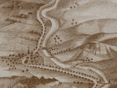 o       Sehen Sie sich hierzu auch einen Kartenausschnitt aus einer Beschreibung von Delkeskamp, die dieser 1859 schuf: "Panorama des Ahrtales von Sinzig (Remagen) bis Kreuzberg oberhalb Altenahr und seine Heilquellen und Bäder (1859)". Obwohl der Ort Dernau recht ungenau festgehalten ist, so sind die ursprüngliche Wegeinfrastruktur und die Ahrüberschwemmungsgebiete recht deutlich zu erkennen.