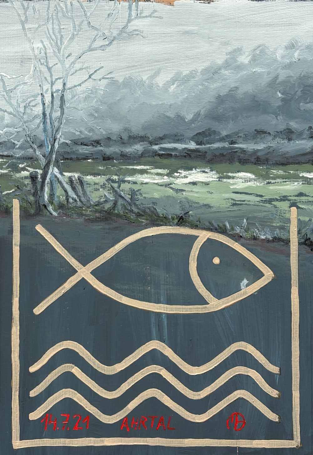 Das gewählte Fischzeichen hat dazu noch eine tiefere Bedeutung: In den Zeiten der Christenverfolgungen war dieses Symbol (ISCHYS=Fisch=geheimes Erkennungszeichen der Christen untereinander) ein verstecktes Symbol, mit dem man vorsichtig zu erkennen geben konnte, dass man ein Anhänger der neuen Religion war. Es war und ist also ein Zeichen der Ho nung, des Glaubens. Was könnte man im Ahrtal zurzeit besser gebrauchen als ein wenig Hoffnung, ein wenig Glauben an eine sichere Zukunft. Soweit zur Geschichte und dem Hintergrund des von mir gewählten Logos zu den Gemälden der Flutgedenken-Serie.