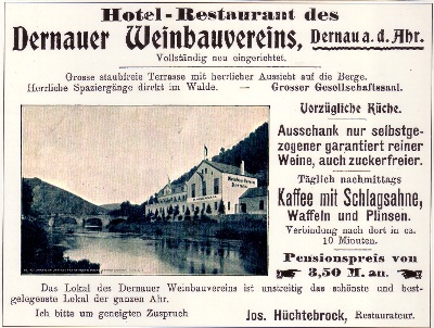 Der Inhalt der Annonce könnte im Frühjahr 2013 fast mit dem geichen Text wieder veröffentlicht werden. Die Genossenschaft Dagernova und die neuen Betreiber Meike und Torsten Carll haben aus dem ehemaligen Kaisersaal mit dem "Culinarium" eine Toplokation an der Ahr geschaffen. Der Satz in der Annonce des ehemaligen Restaurateurs Hüchtebrock aus dem Jahre 1907: