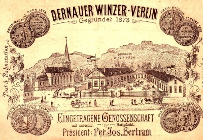 Um nicht einen uralten innerdernauer Streit zwischen den Mitgliedern von Winzer-Verein / Weinbau-Verein neu zu entfachen(;-)) wird nachstehend, aus Gründen der "political correctness" eine sehr sehenswerte alte Annonce des Winzer-Vereins (ca. 1885) unter ihrem langjährigen Gründungspräsidenten Peter Joseph Bertram gezeigt.(von D. Koll). Man beachte die Details der Darstellung.